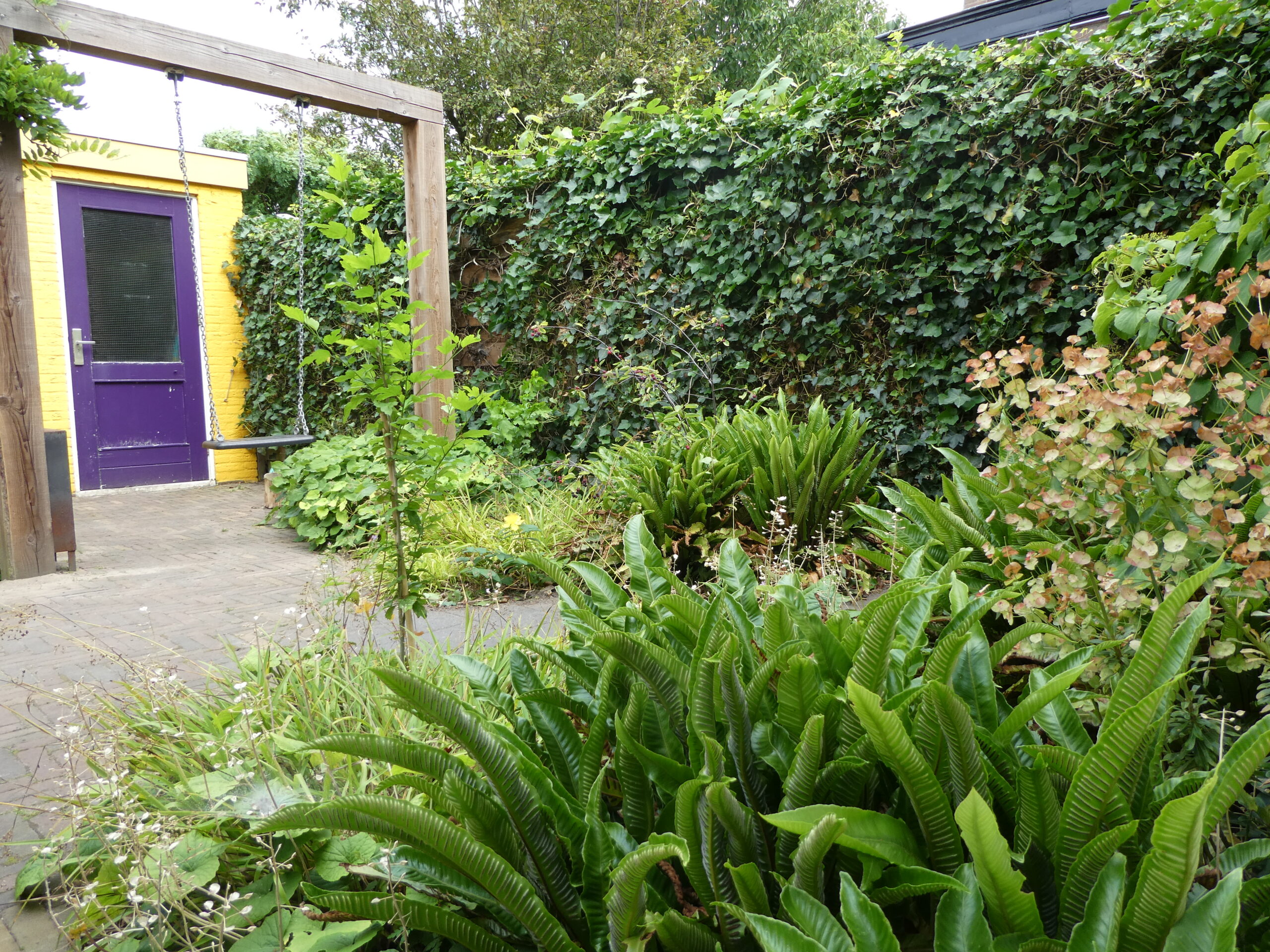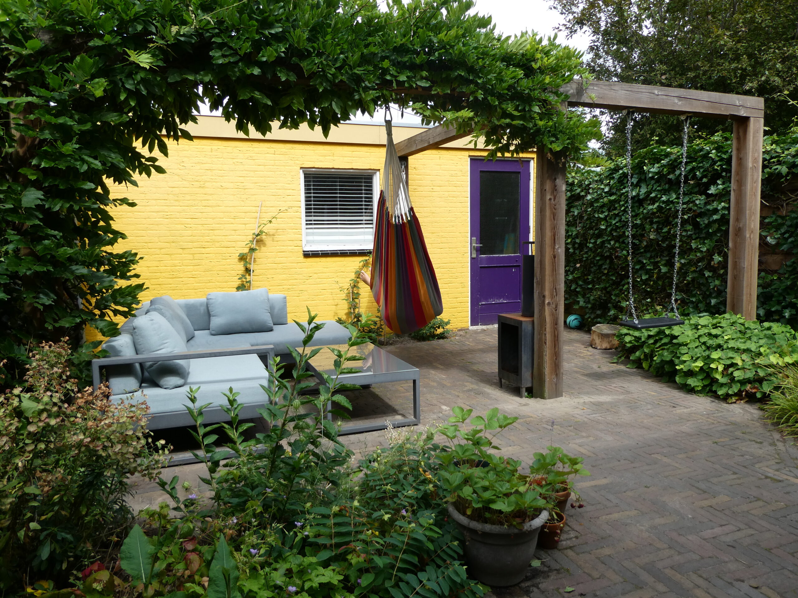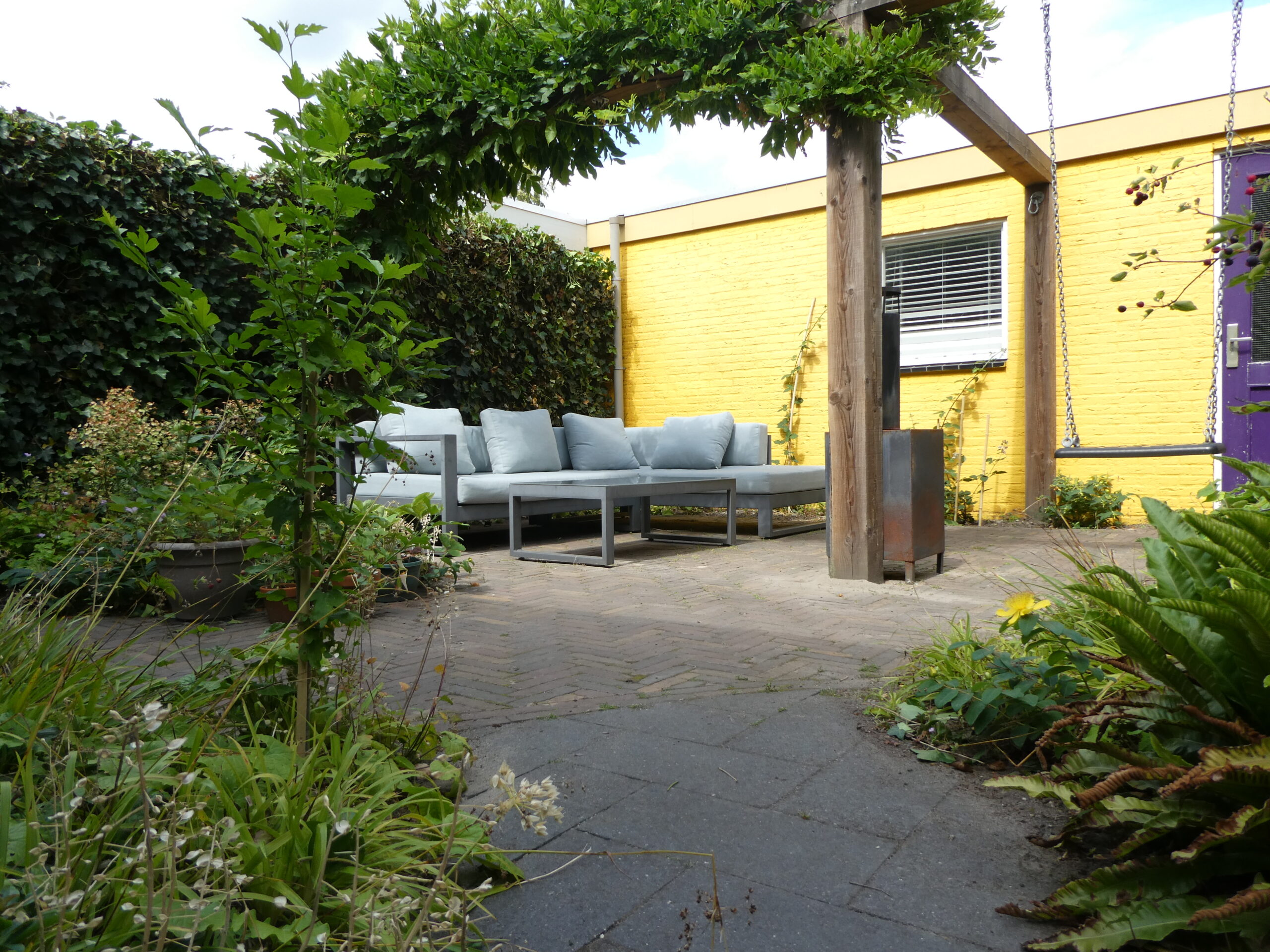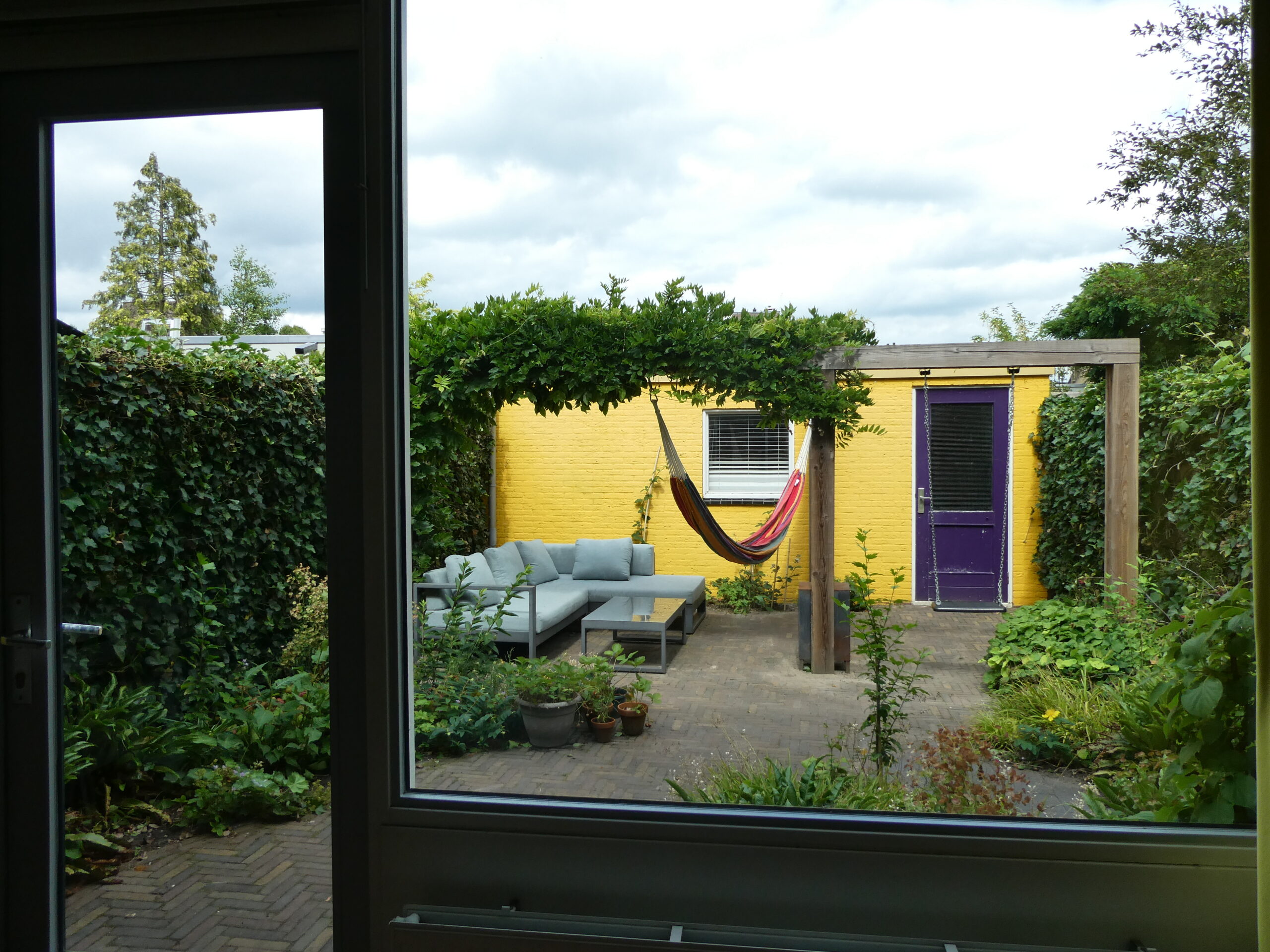 Vanuit de woonkamer kijkt men direct uit op de tuin en op de muur van de garage. Voor meer kleur heeft die muur een gele tint gekregen zodat het buitenbeeld zonnig gekleurd is. Om een ruimtelijk effect te creëren is een houten pergola geplaatst die begroeid wordt door een blauwe regen. In de schaduwborders staan met name groenblijvende planten zodat in de winter de tuin mooi met blad begroeid is. De regenton heeft zijn natuurlijke plek en wordt begroeid met een klimhortensia.