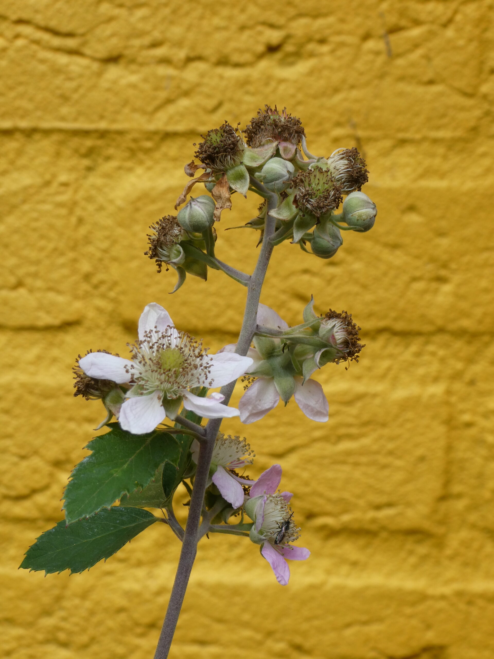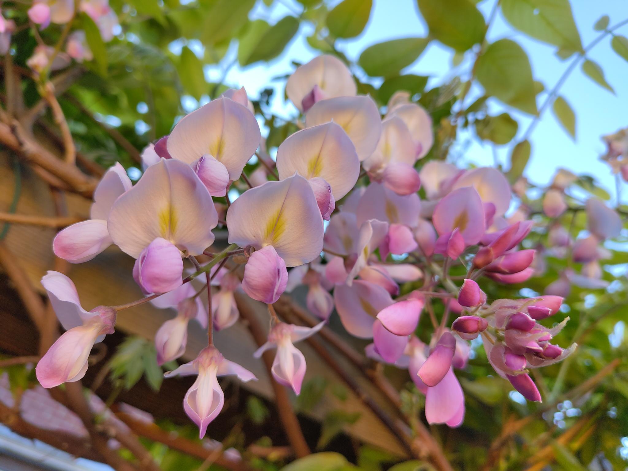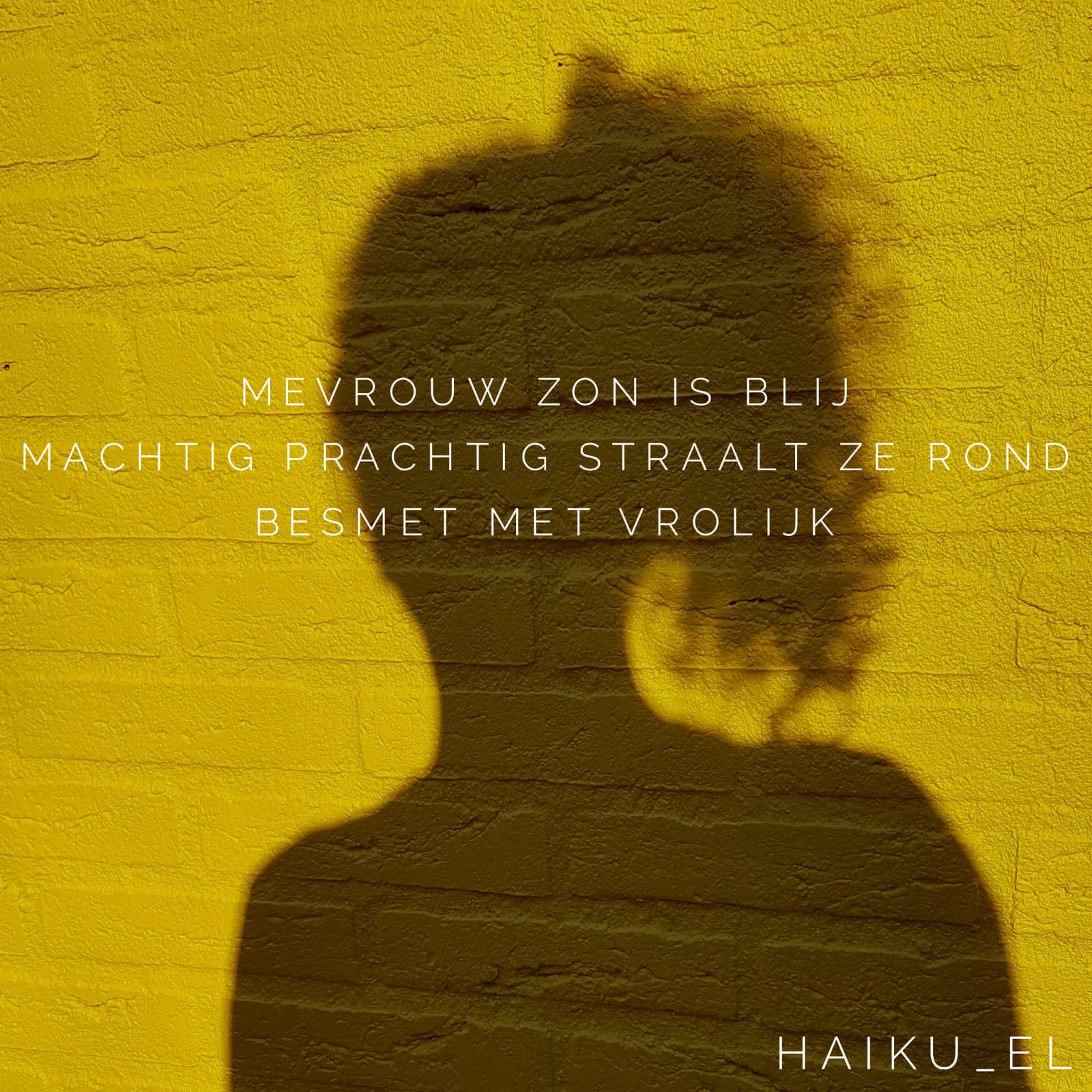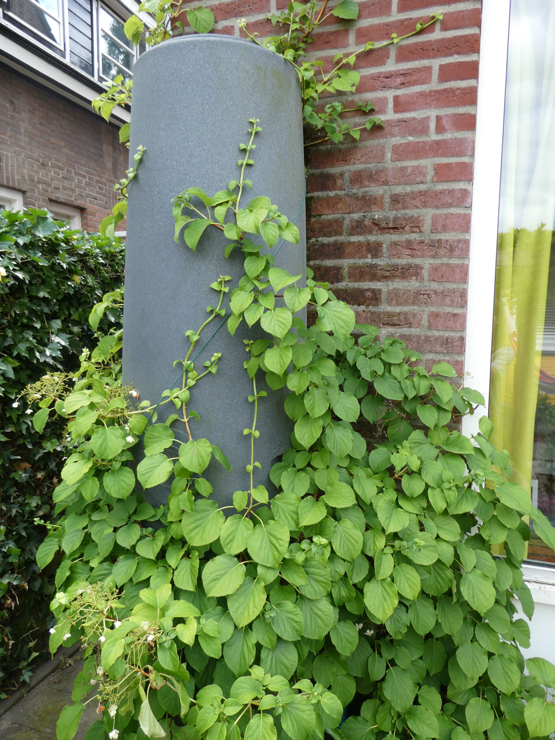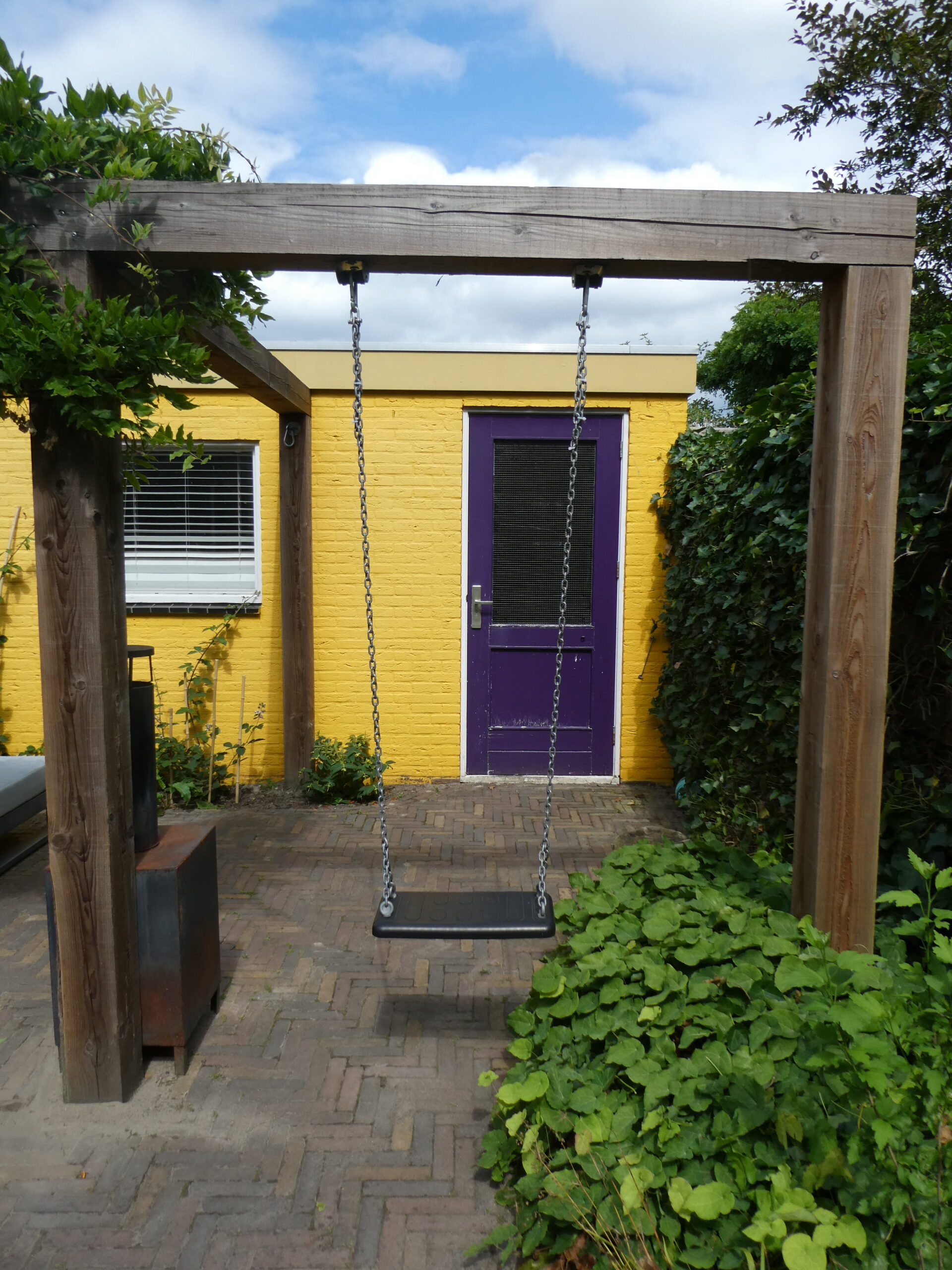 Vanuit de woonkamer kijkt men direct uit op de tuin en op de muur van de garage. Voor meer kleur heeft die muur een gele tint gekregen zodat het buitenbeeld zonnig gekleurd is. Om een ruimtelijk effect te creëren is een houten pergola geplaatst die begroeid wordt door een blauwe regen. In de schaduwborders staan met name groenblijvende planten zodat in de winter de tuin mooi met blad begroeid is. De regenton heeft zijn natuurlijke plek en wordt begroeid met een klimhortensia.
