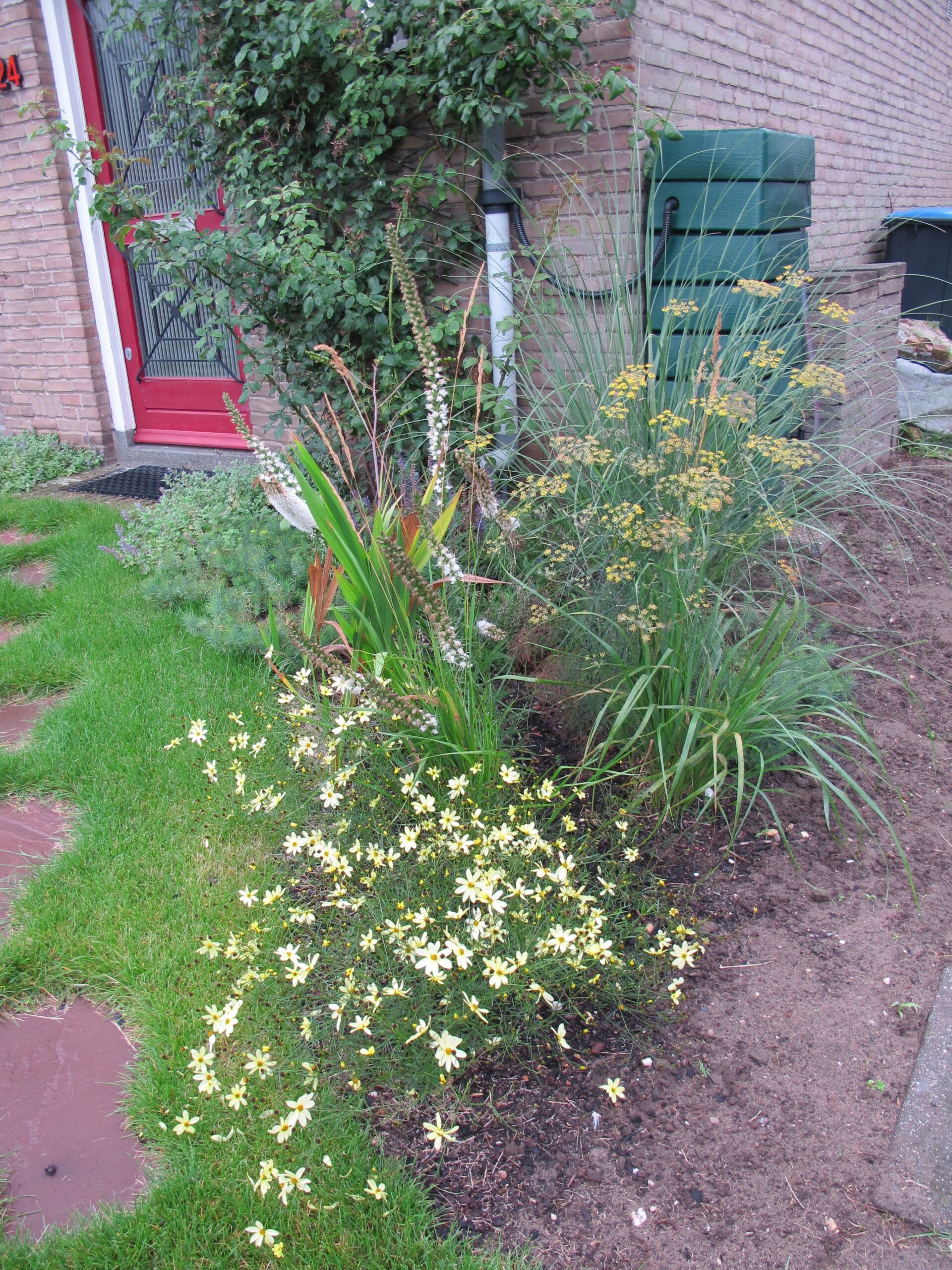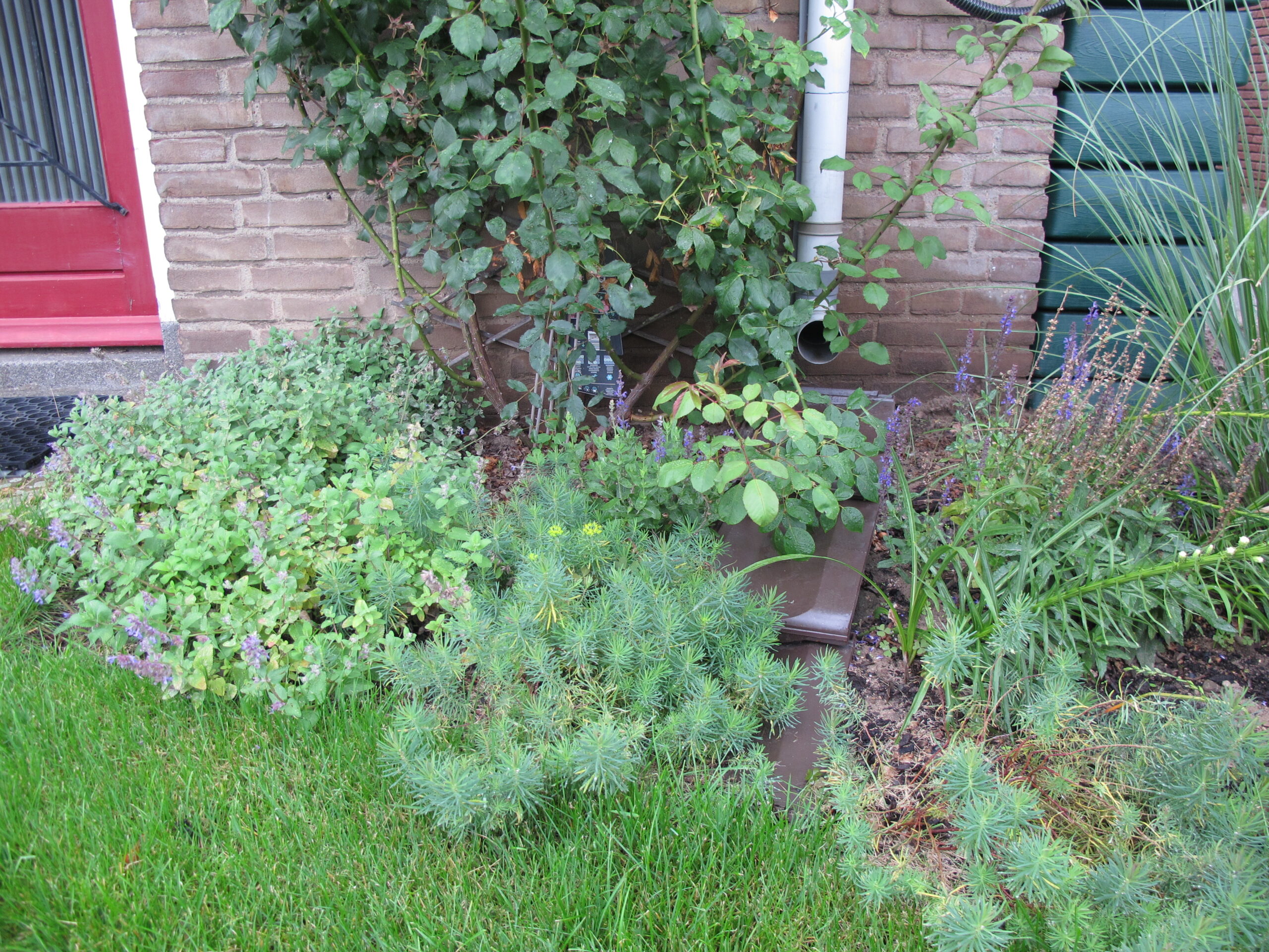 De stapstenen brengen je naar de voordeur waar je ook een paar dakpannen ziet die het water uit de regenpijp bij hevige regenval daar over laat stromen. Door de zanderige ondergrond zakt dit water gauw de bodem in. Maar eerst gaat het regenwater naar de regenton en als deze vol is gaat het via de regenpijp de tuin in.