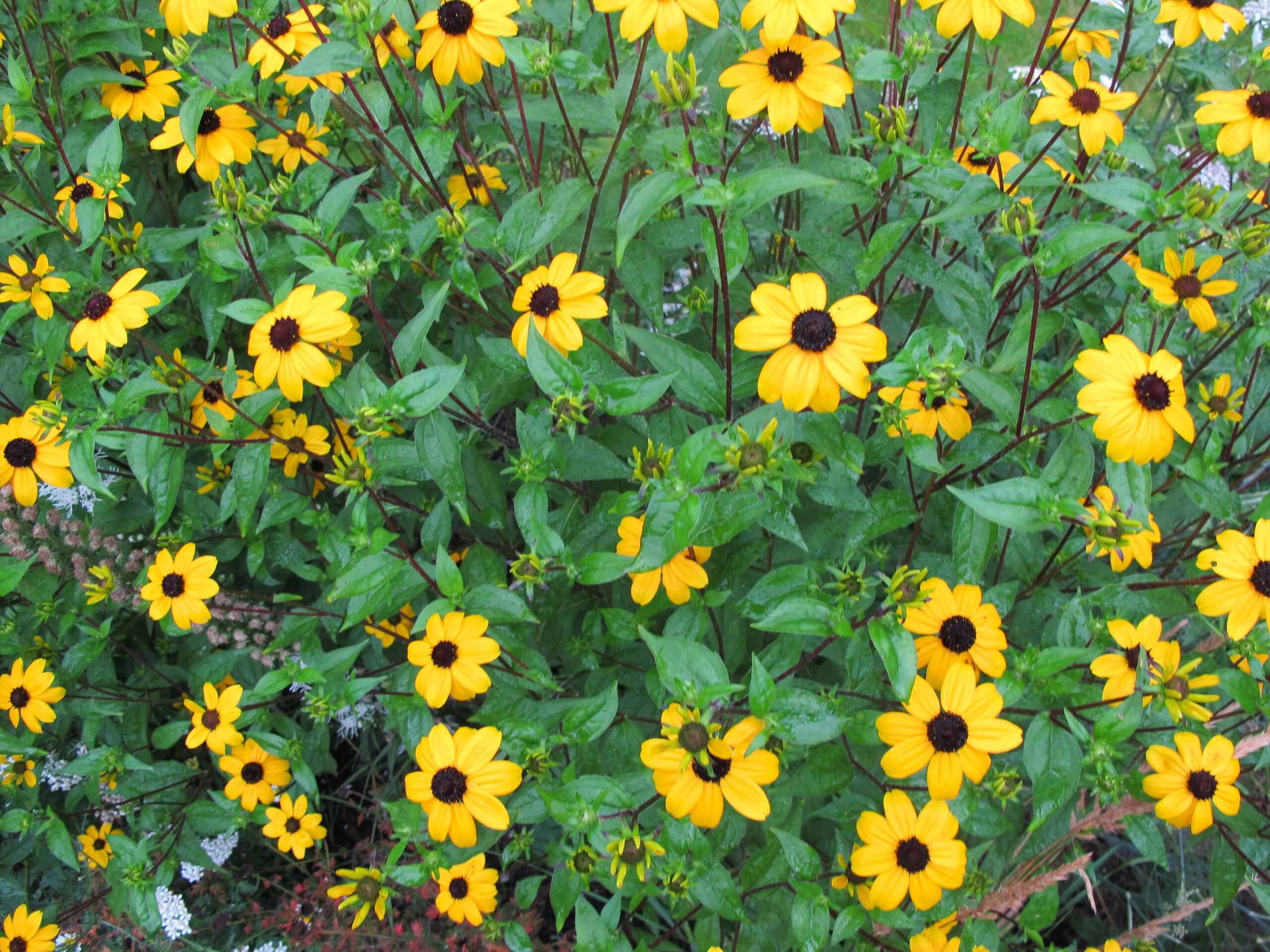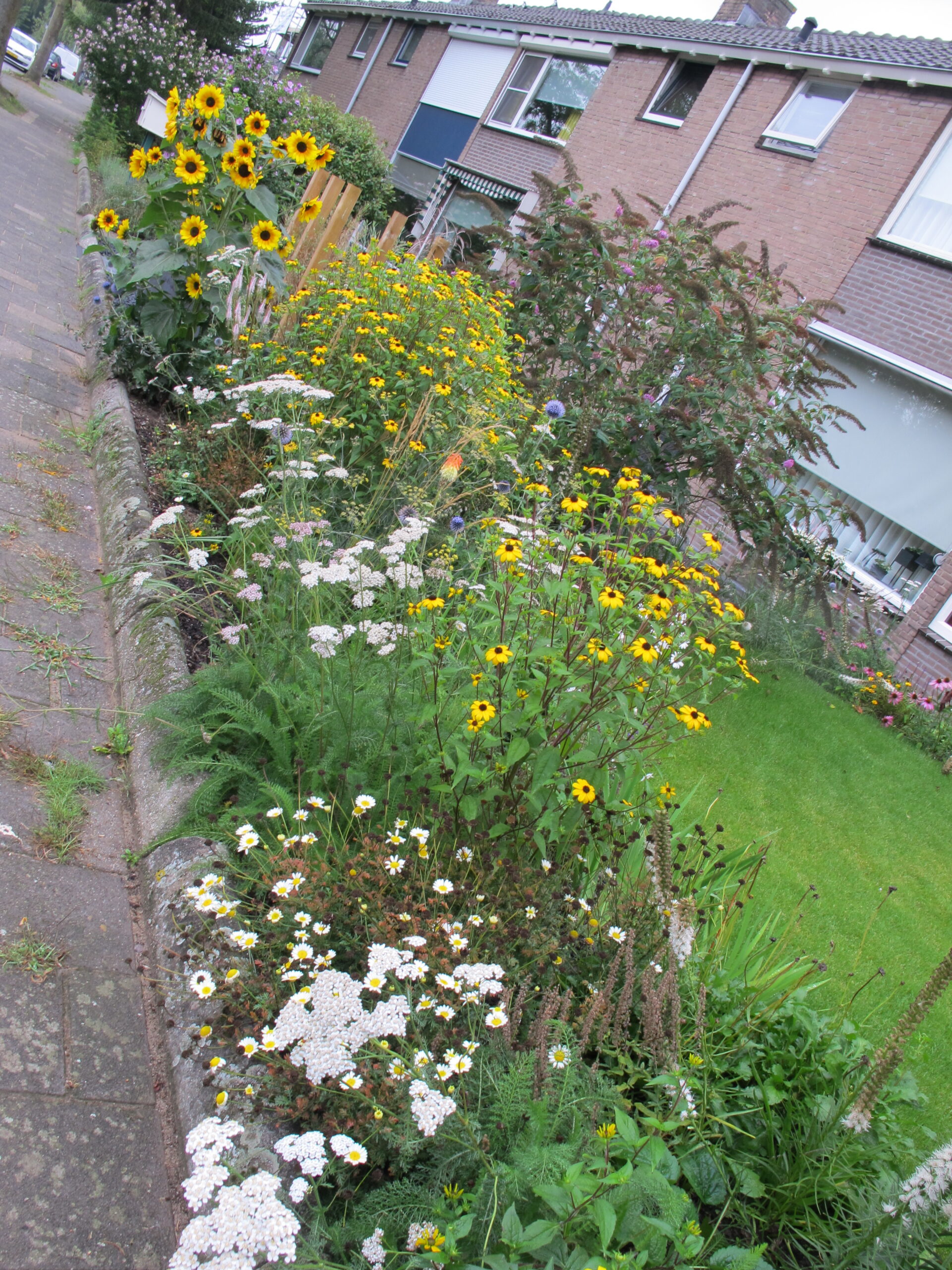 De zelf gezaaide zonnebloemen geven een vrolijke noot in deze fleurige voortuin!