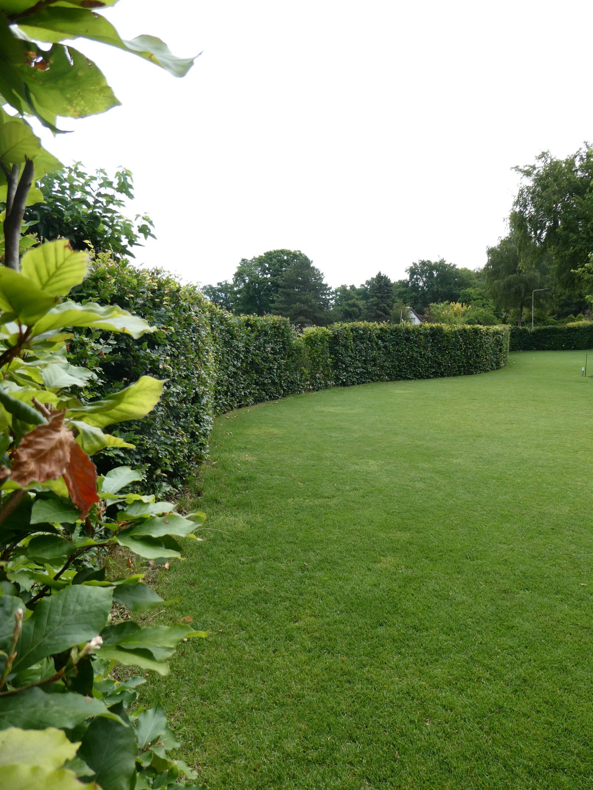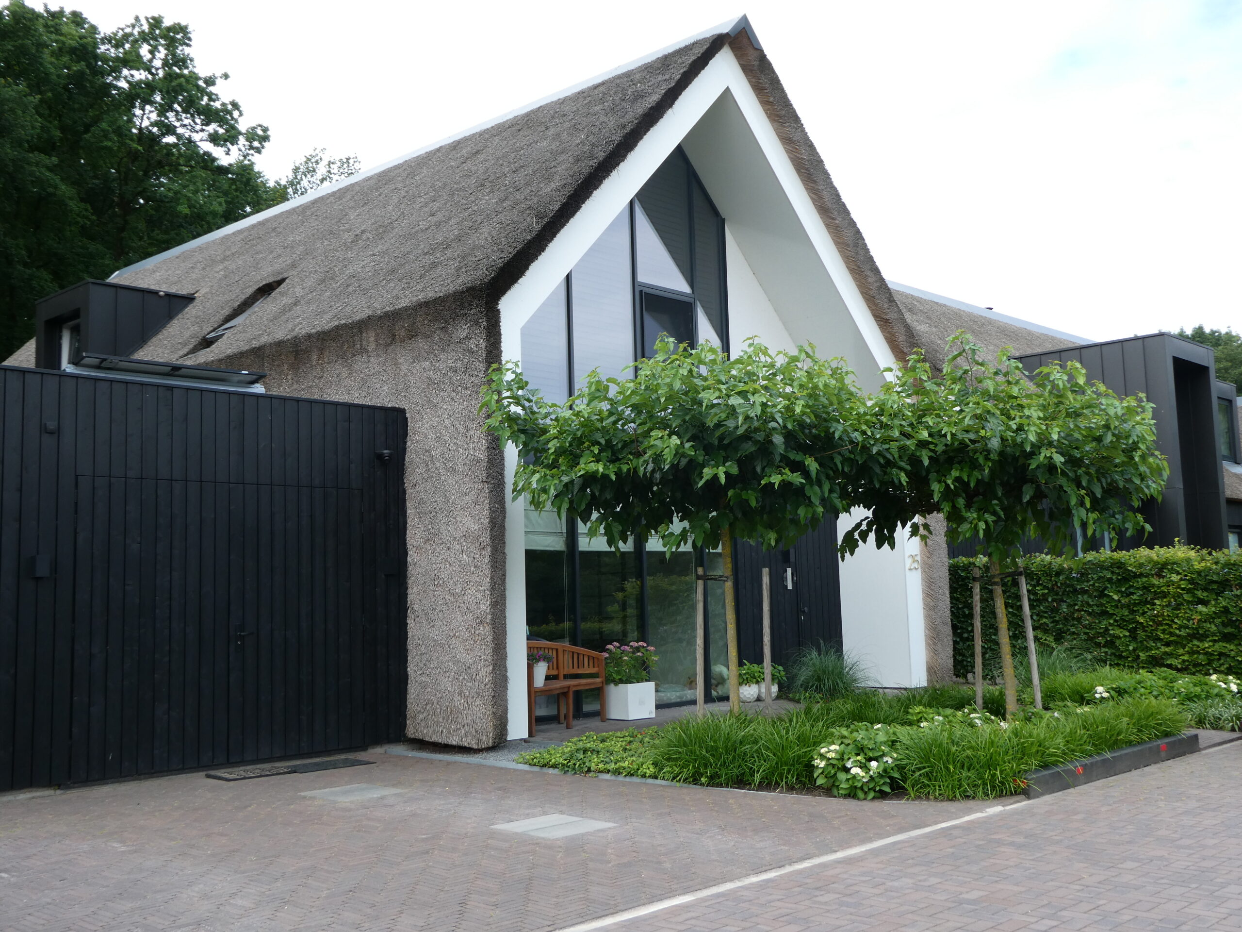 Aan de straatzijde wordt de tuin afgeschermd door een beukenhaag, die privacy biedt zonder de openheid van het ontwerp teniet te doen.