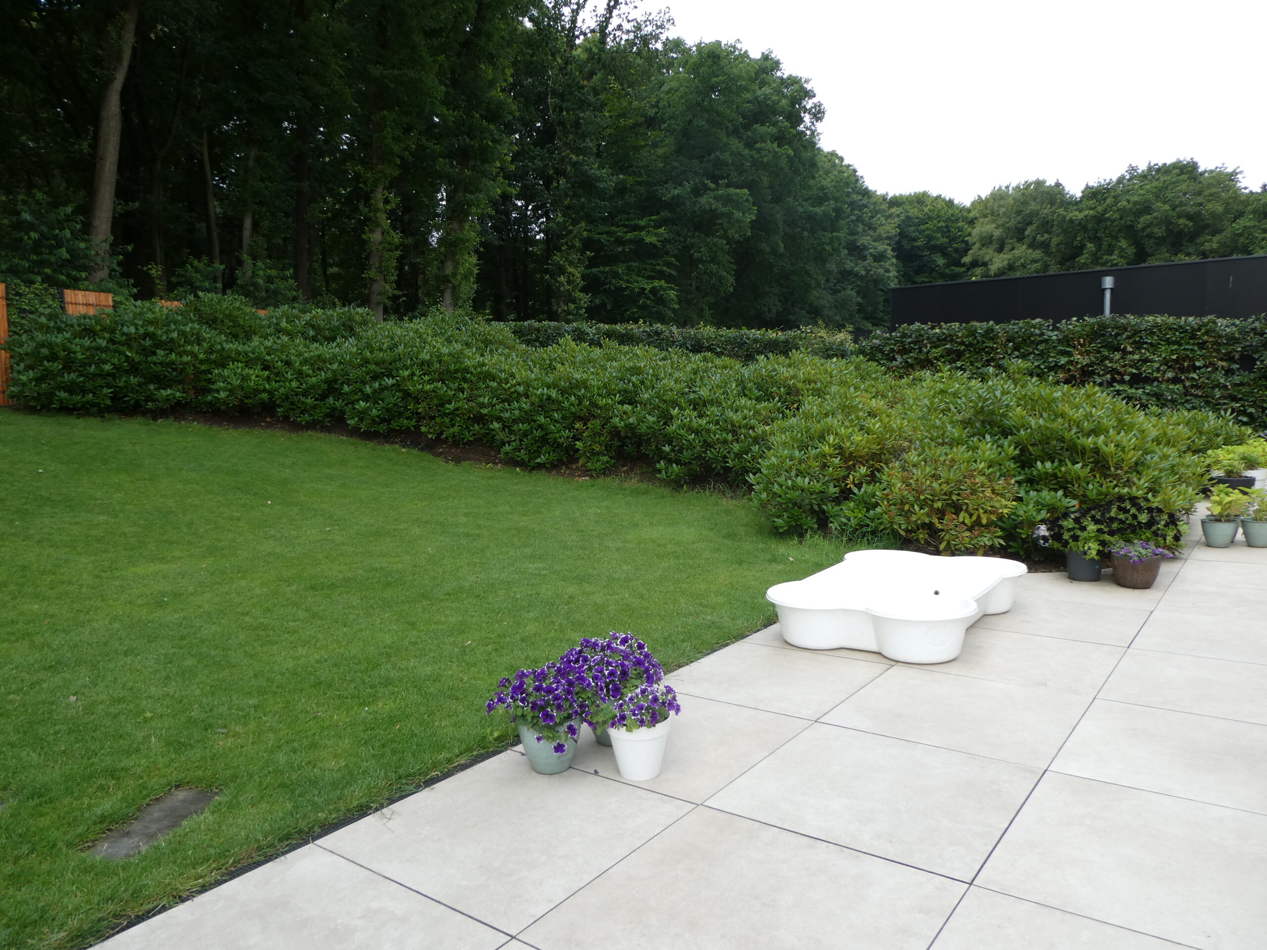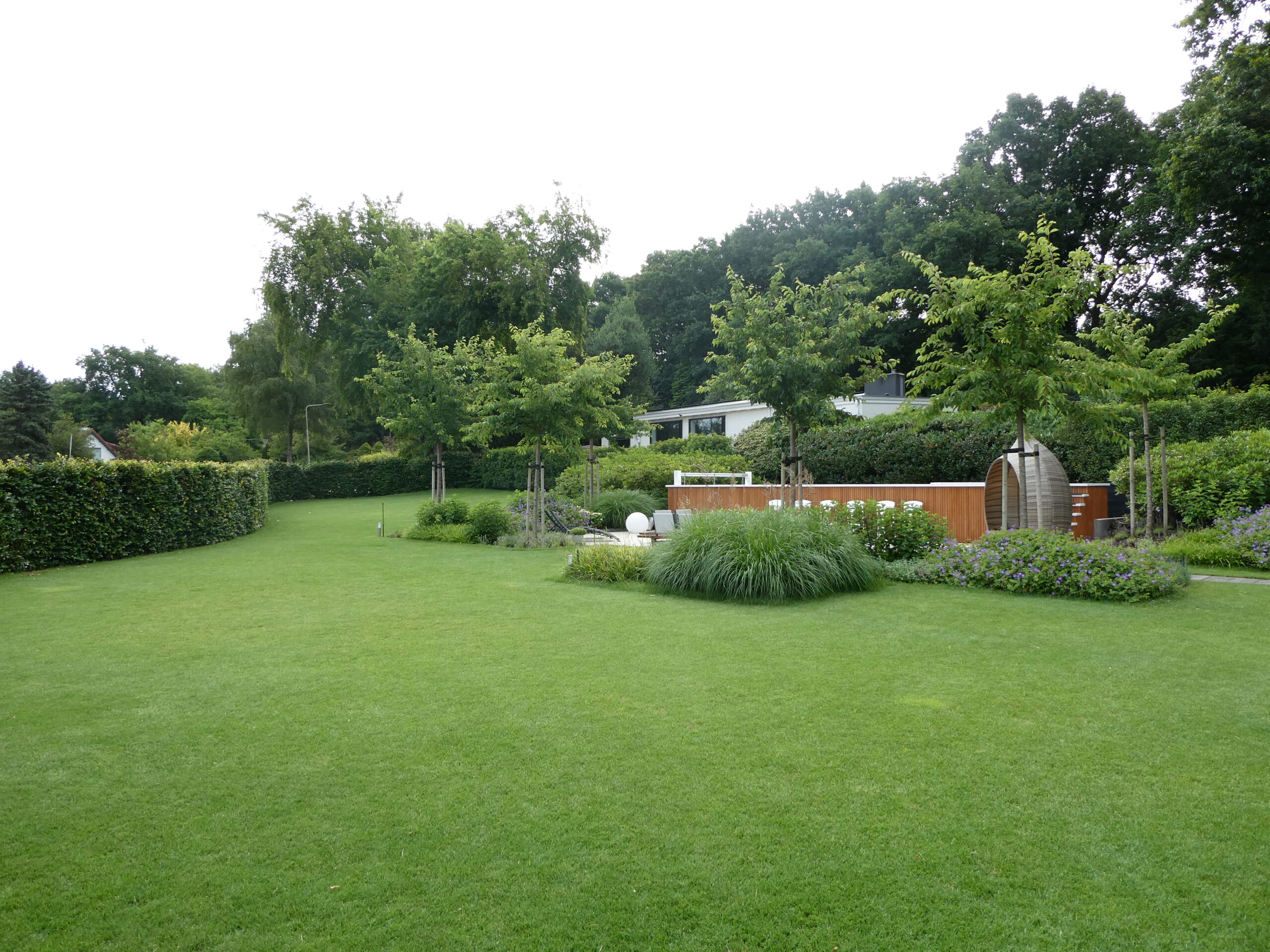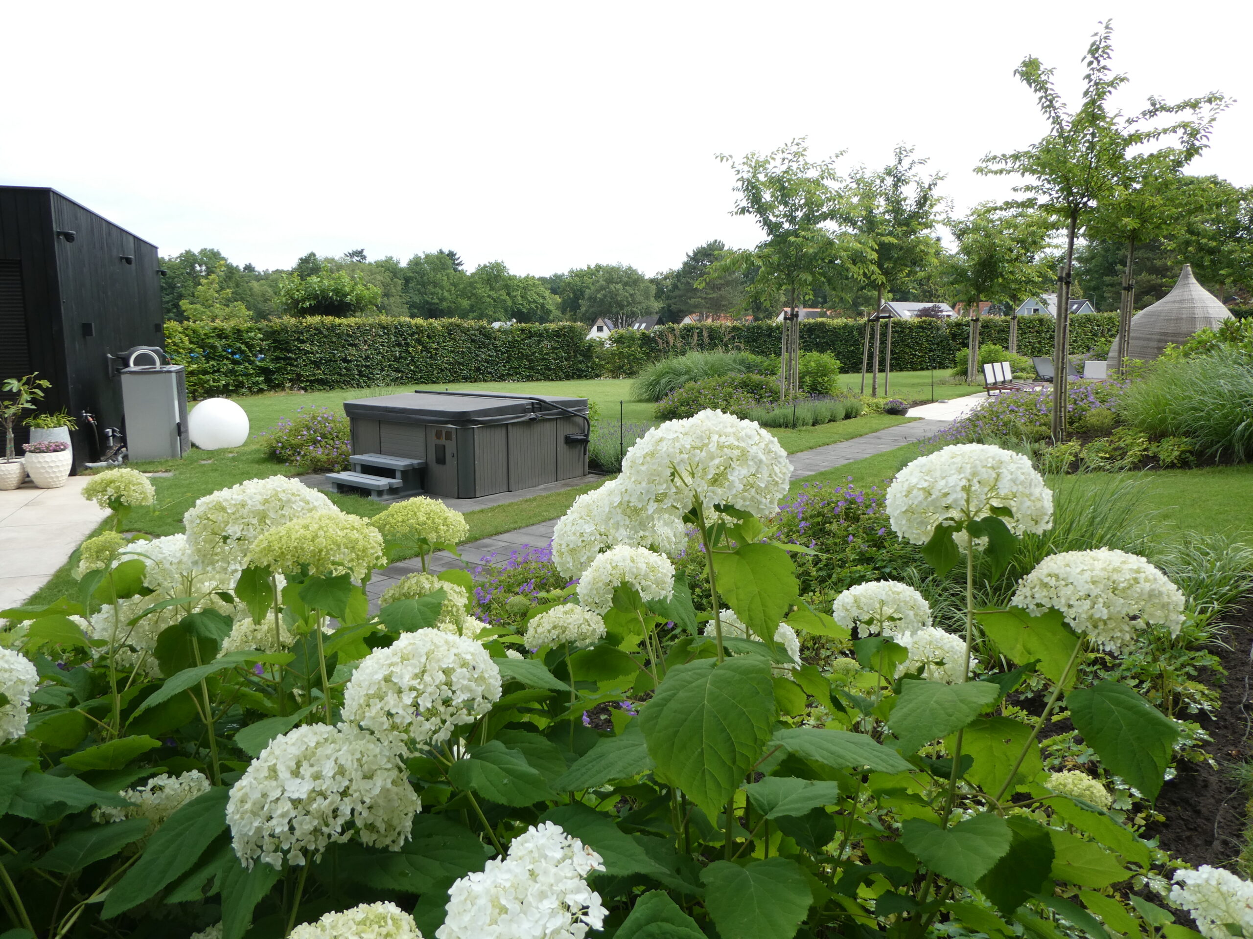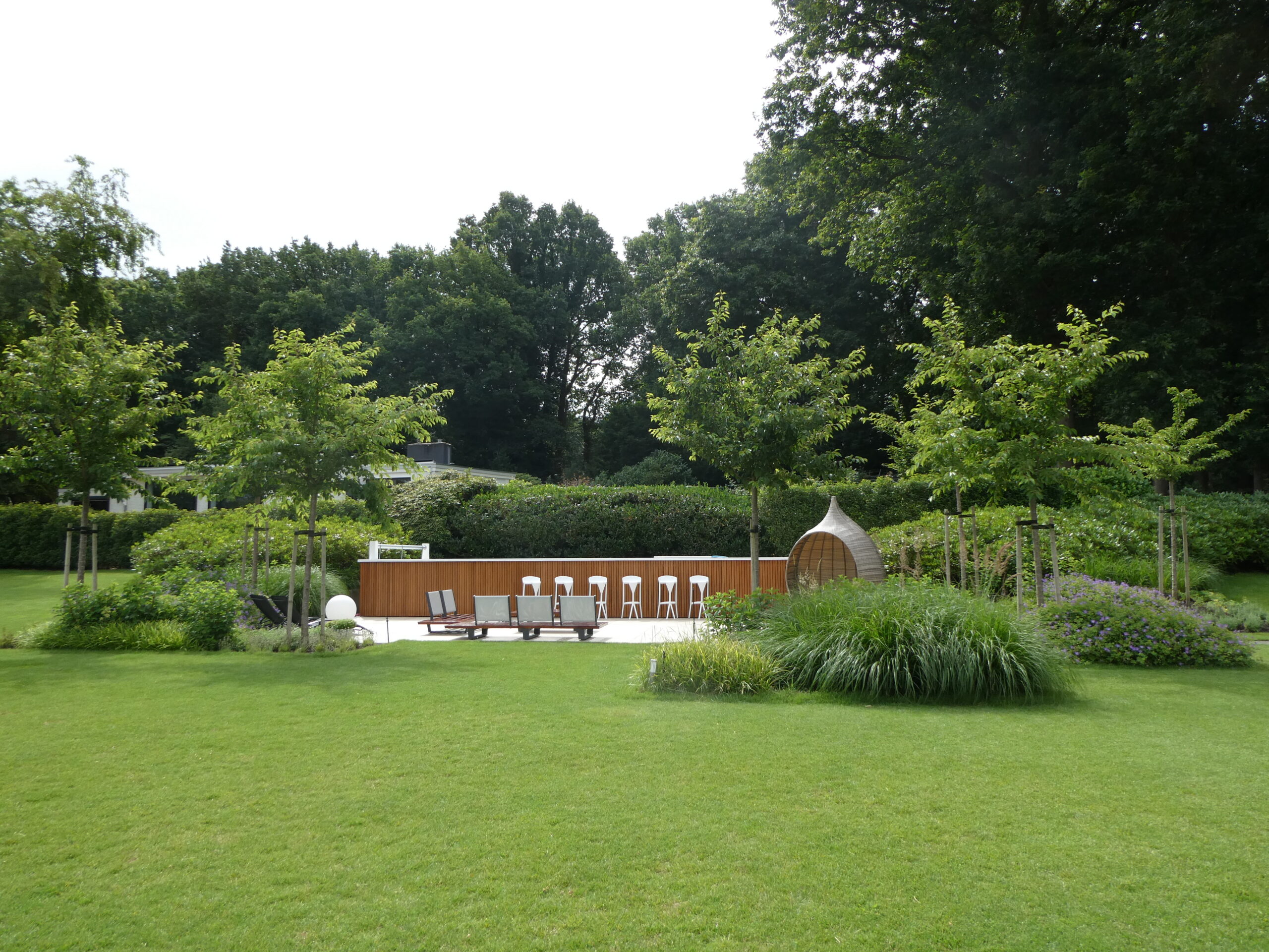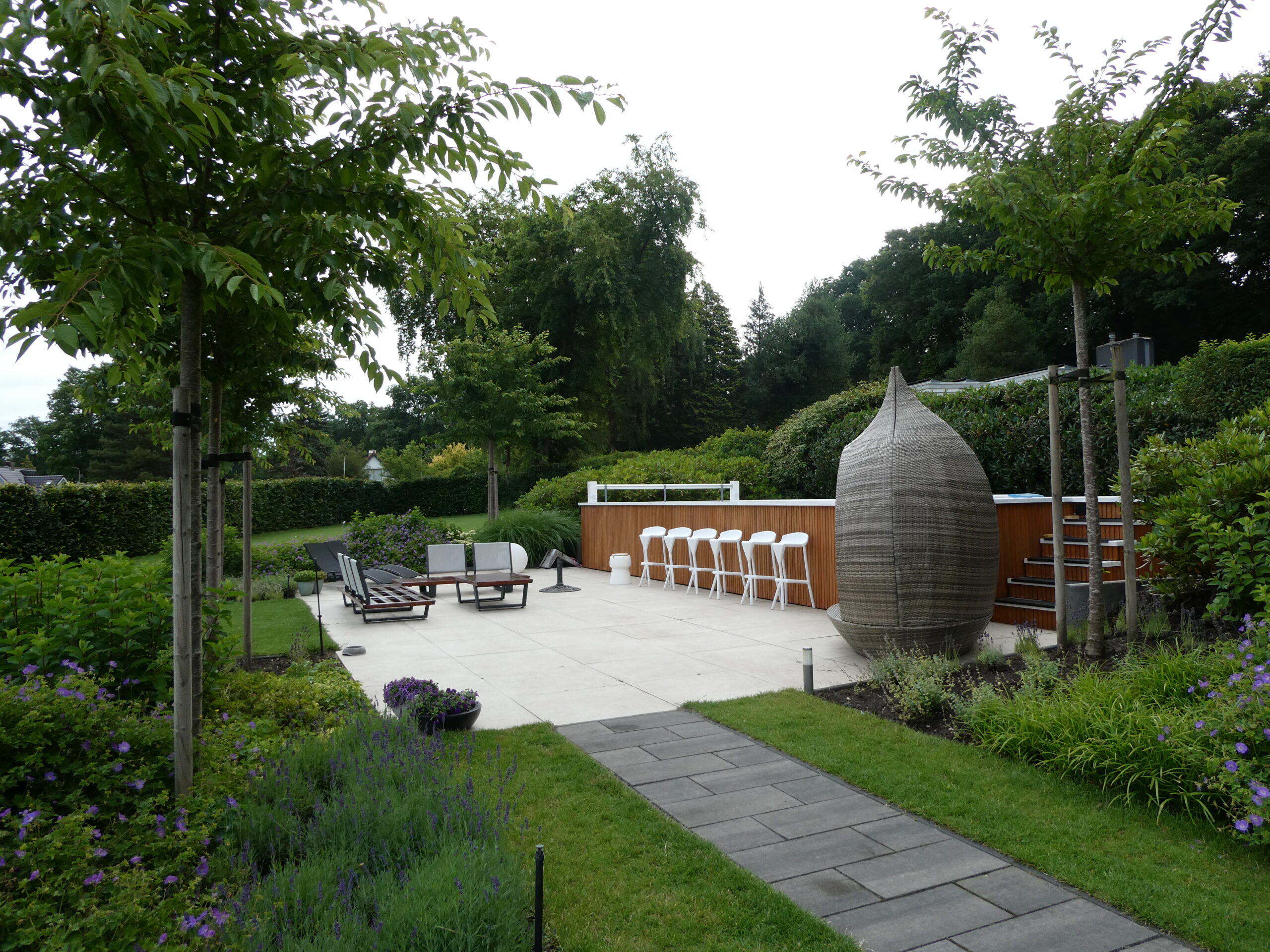 Een belangrijke wens van de opdrachtgever was het realiseren van een zwembad. Vanwege de beperkingen in het bestemmingsplan bleek een ingegraven zwembad niet mogelijk. Daarom is gekozen voor een opbouwzwembad, dat is geïntegreerd in een ruim terras. Rondom dit terras zijn borders aangelegd, waarbij het kleuraccent ligt op blauw en wit. De sierappels bij het terras versterken de lijn tussen de woning en het zwembad en zorgen tegelijk voor een beschutte, sfeervolle plek.
