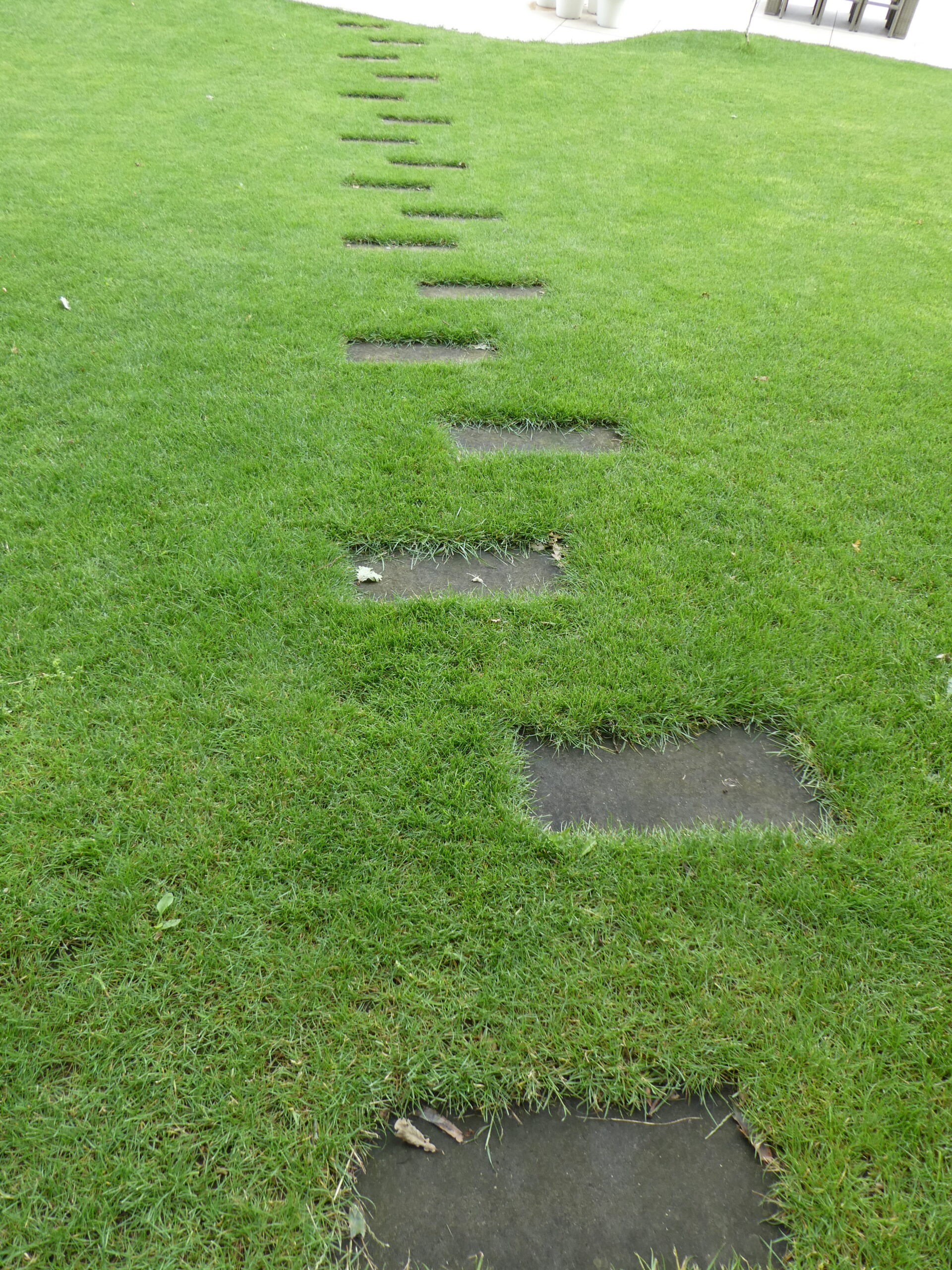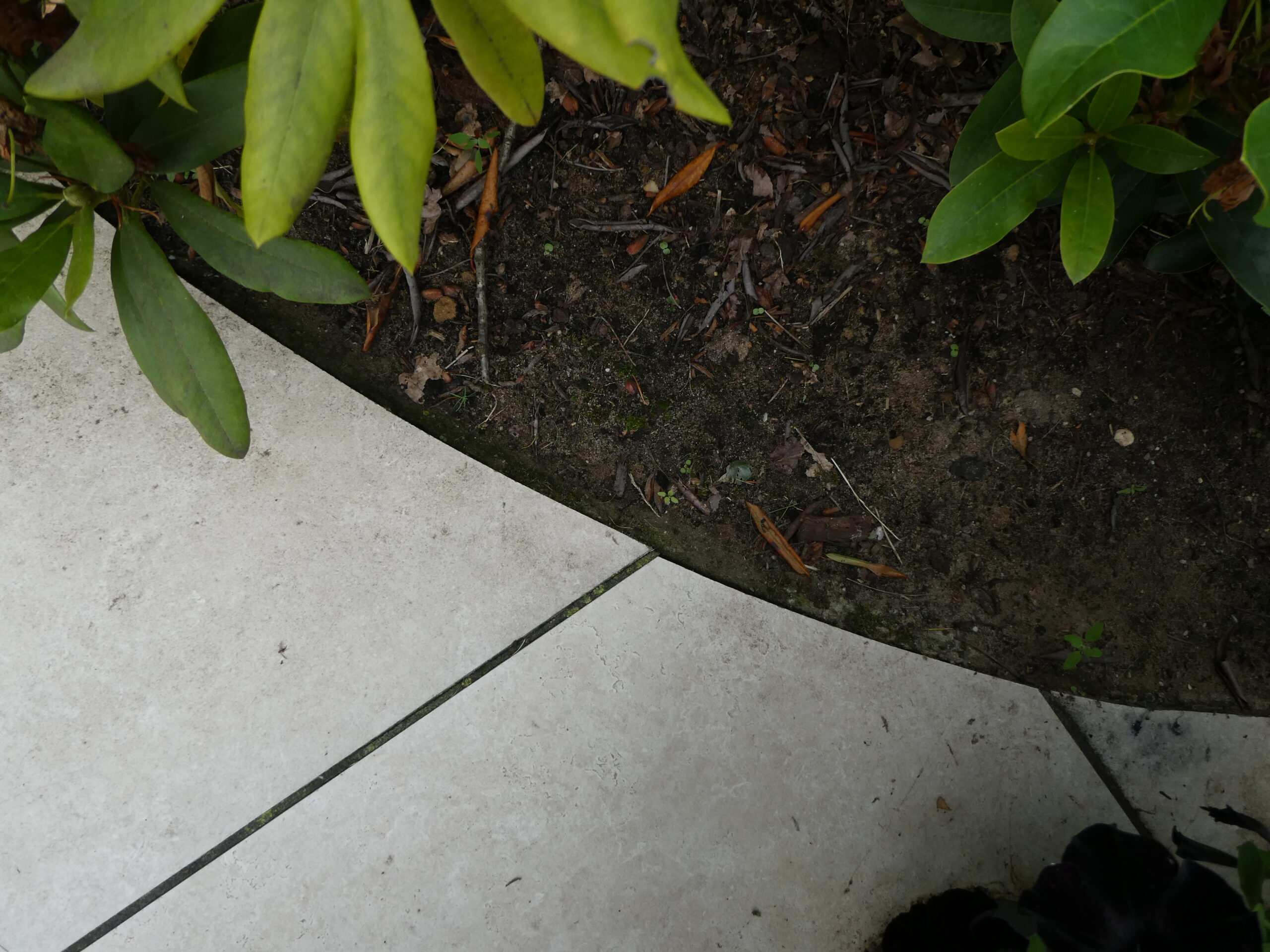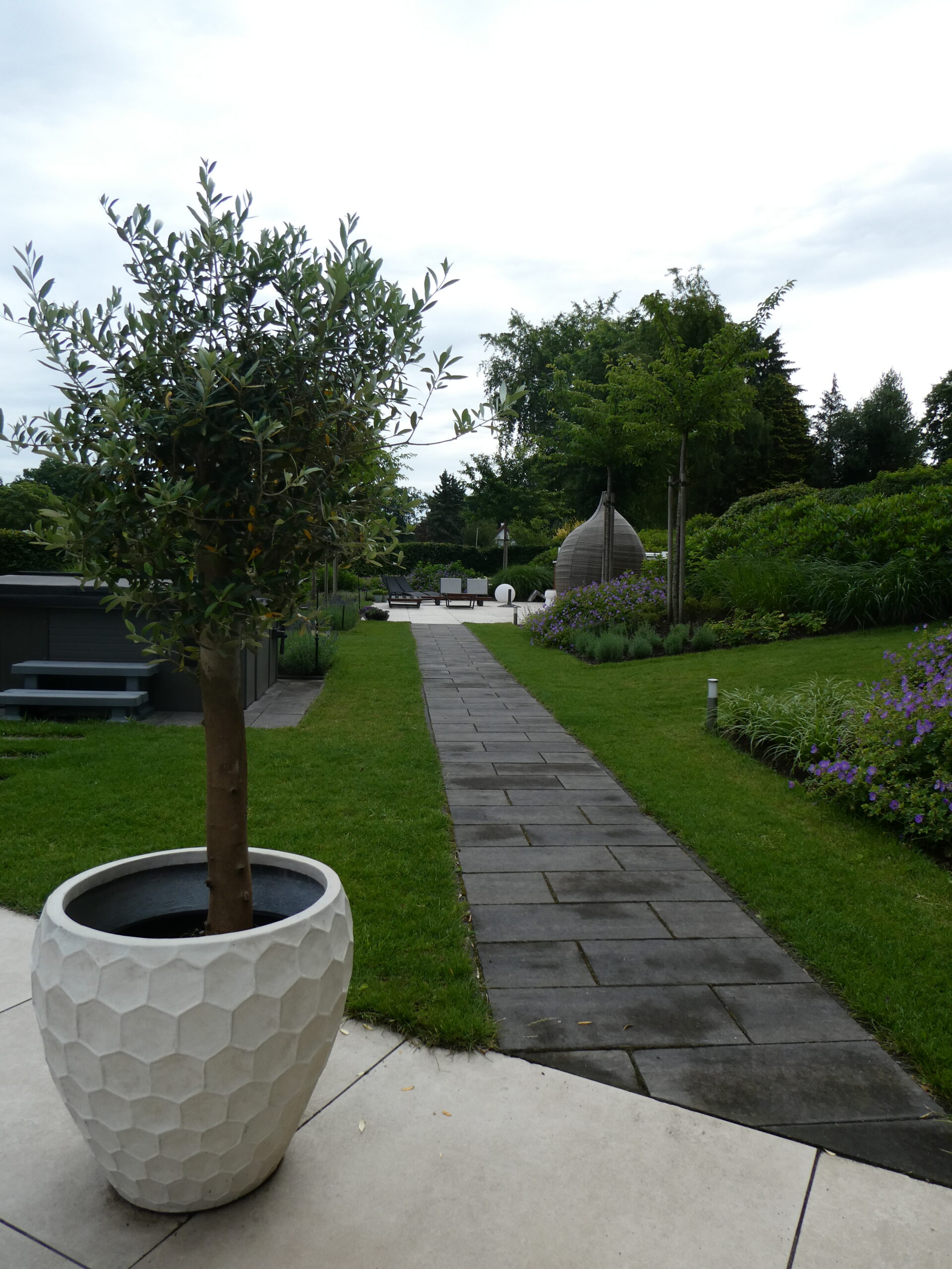 Het rechte pad dat richting het zwembad loopt, vormt een belangrijke verbindingsas tussen de twee belangrijkste verblijfsplekken in de tuin. De ruime opzet geeft de tuin een open karakter, waarin gazons, sierborders en sierappels zijn opgenomen. De sierappels zorgen in het voorjaar voor een uitbundige bloei en dragen bij aan een intieme sfeer. Grote vlakken met bloeiende rododendrons creëren rust én een kleurrijk spektakel in het voorjaar.